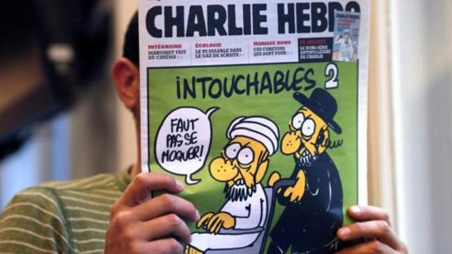 Na obálce francouzského časopisu je ortodoxní Žid, který tlačí člověka s turbanem na hlavě sedícího v kolečkovém křesle. Jde o narážku na francouzský film o ochrnutém bělošském muži a jeho černošském asistentovi. Uvnitř čísla je několik obrázků, které si dělají legraci z proroka Mohameda, na některých z nich je nahý.