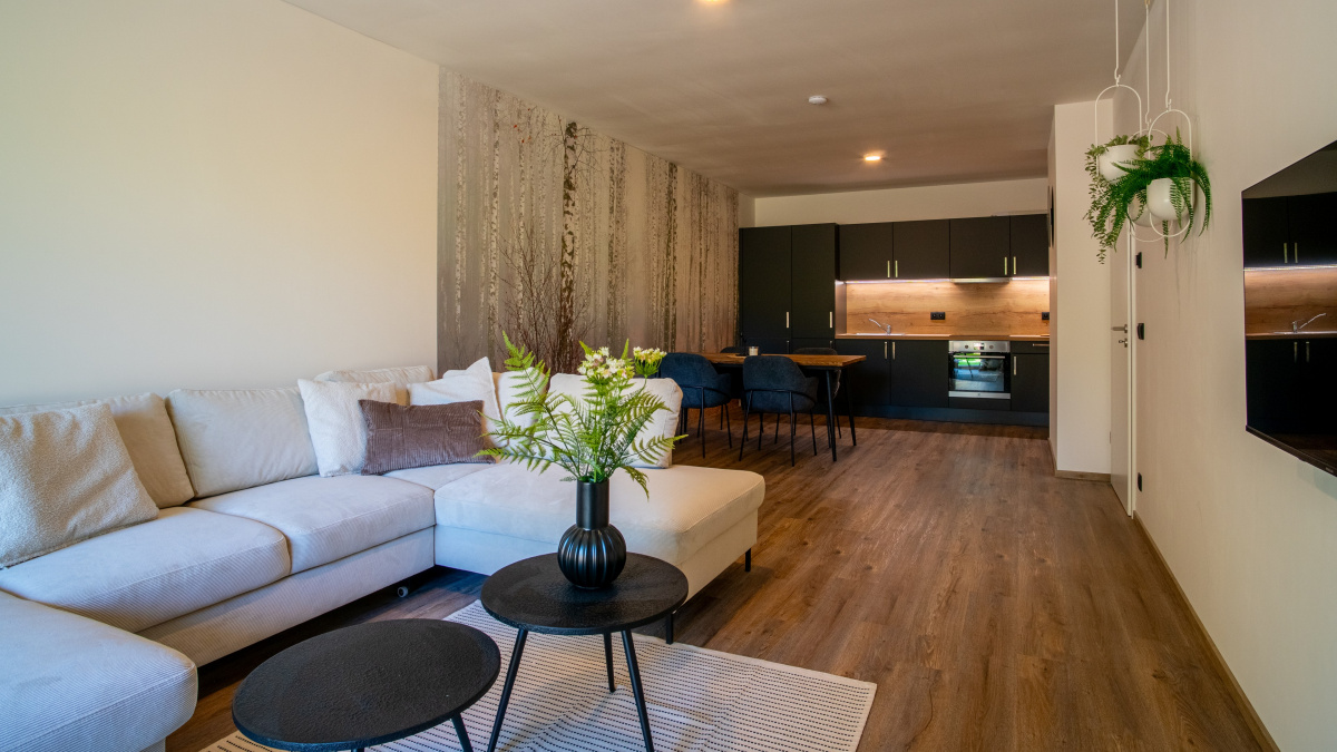 Hlavním sjednocujícím prvkem všech kuchyní je práce s dekorem přírodního dřeva, jenž okamžitě upoutá zrak a odkazuje na šumavské lesy. Stejný motiv se objevuje i na jídelních stolech a doplňcích, což zajišťuje útulnou atmosféru. Druhou výraznou dominantou jsou velkoformátové tapety s motivem lesa či bříz, které vytvářejí iluzi, že příroda doslova vstupuje do interiéru. Díky tomu kuchyňské kouty nepůsobí jen prakticky, ale stávají se estetickým a emocionálním centrem bytu.