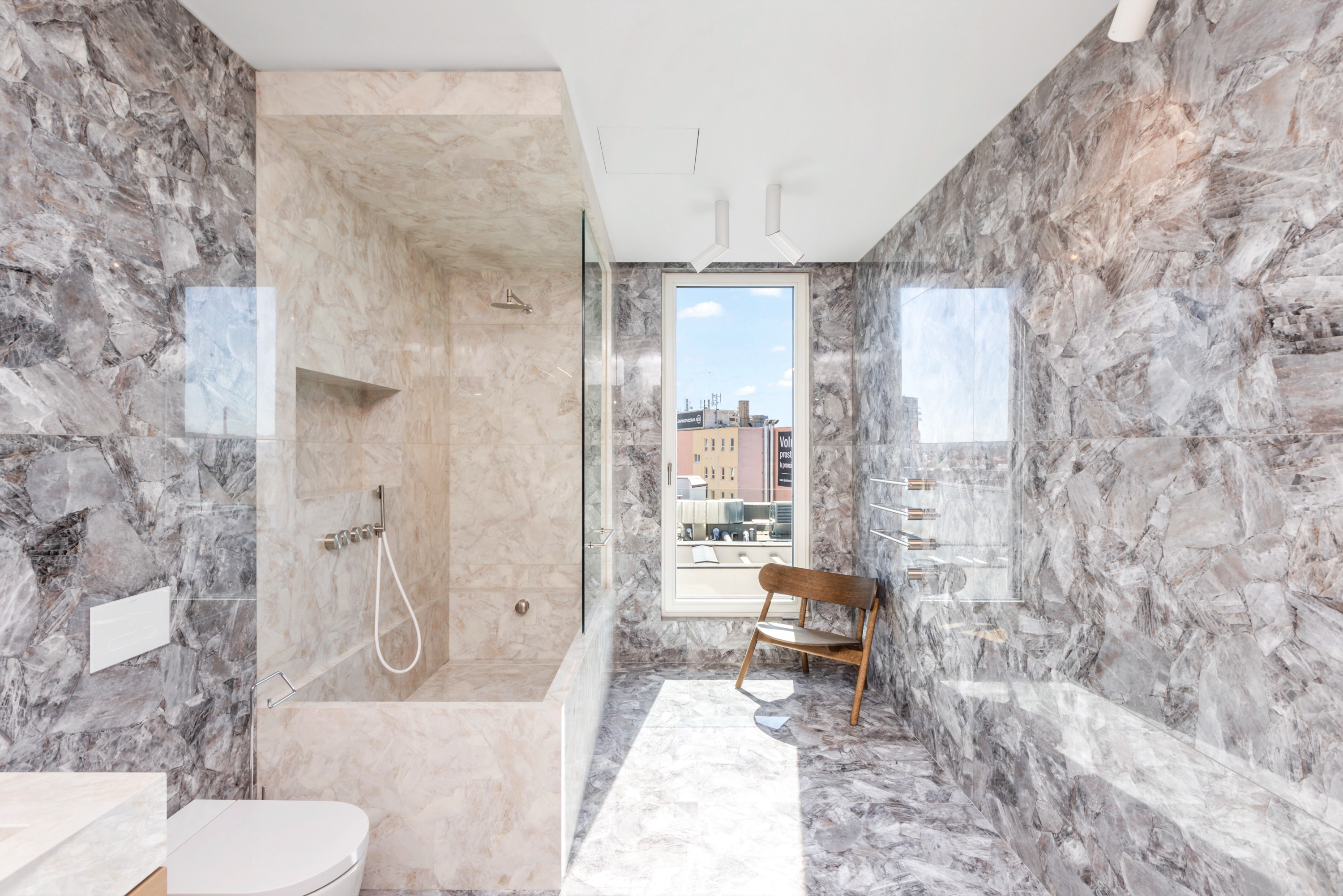Tři koupelny jsou postaveny na kontrastu světlého a tmavého kamene s přírodní kresbou. Bezrámová skla sprchových koutů, volně stojící vany a zabudované niky na kosmetiku podtrhují čistotu a eleganci prostoru. V jedné z koupelen se nachází i sauna s výhledem na město, což umocňuje pocit, že wellness máte doslova doma.