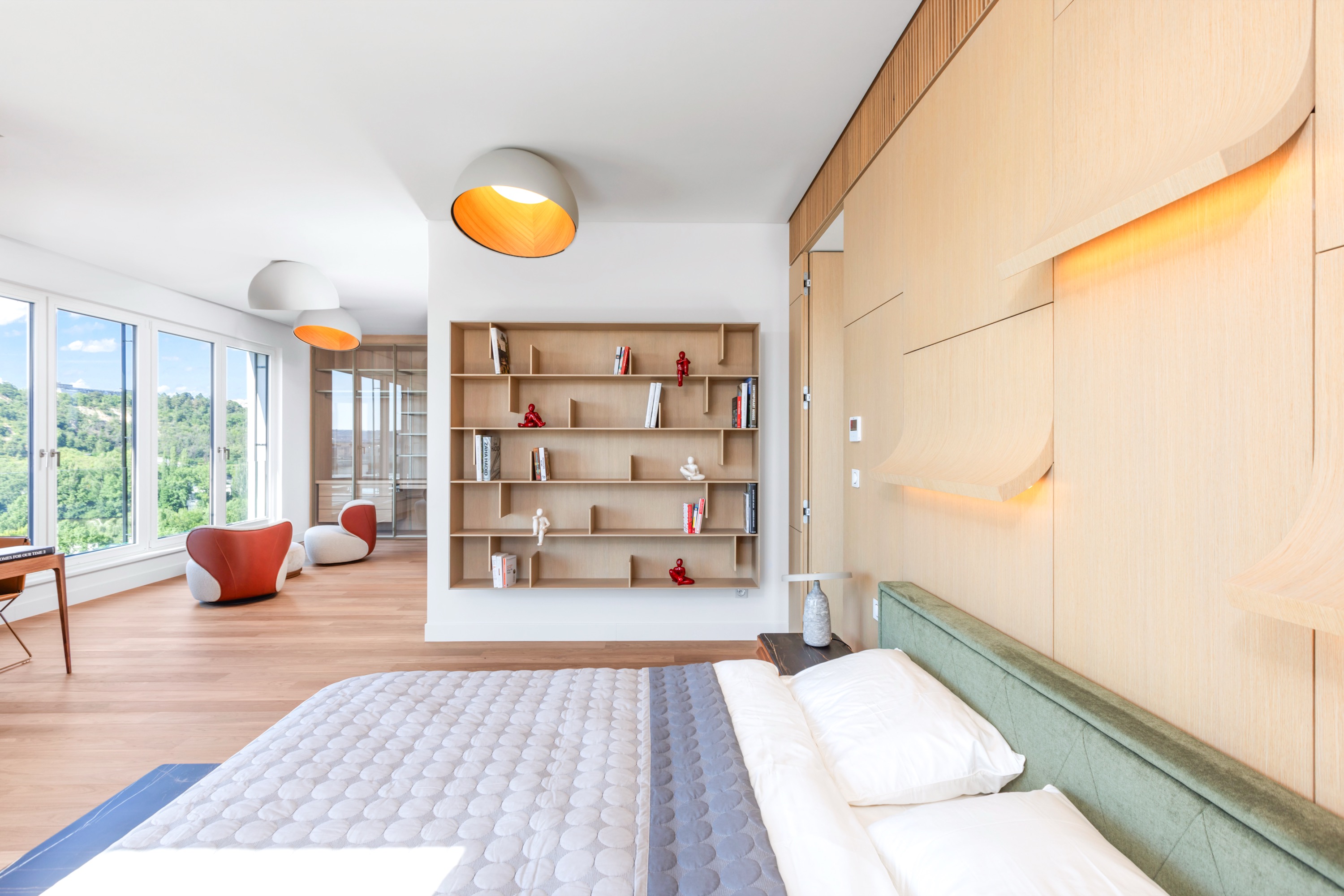 Interiér sází na teplé tóny dubového dřeva v kombinaci s jemným čalouněným čelem postele v tlumené zelené. Vestavěné knihovny a nábytkové prvky na míru vytvářejí čistou, uklidňující linii, zatímco designová svítidla dodávají večerům hřejivý nádech.