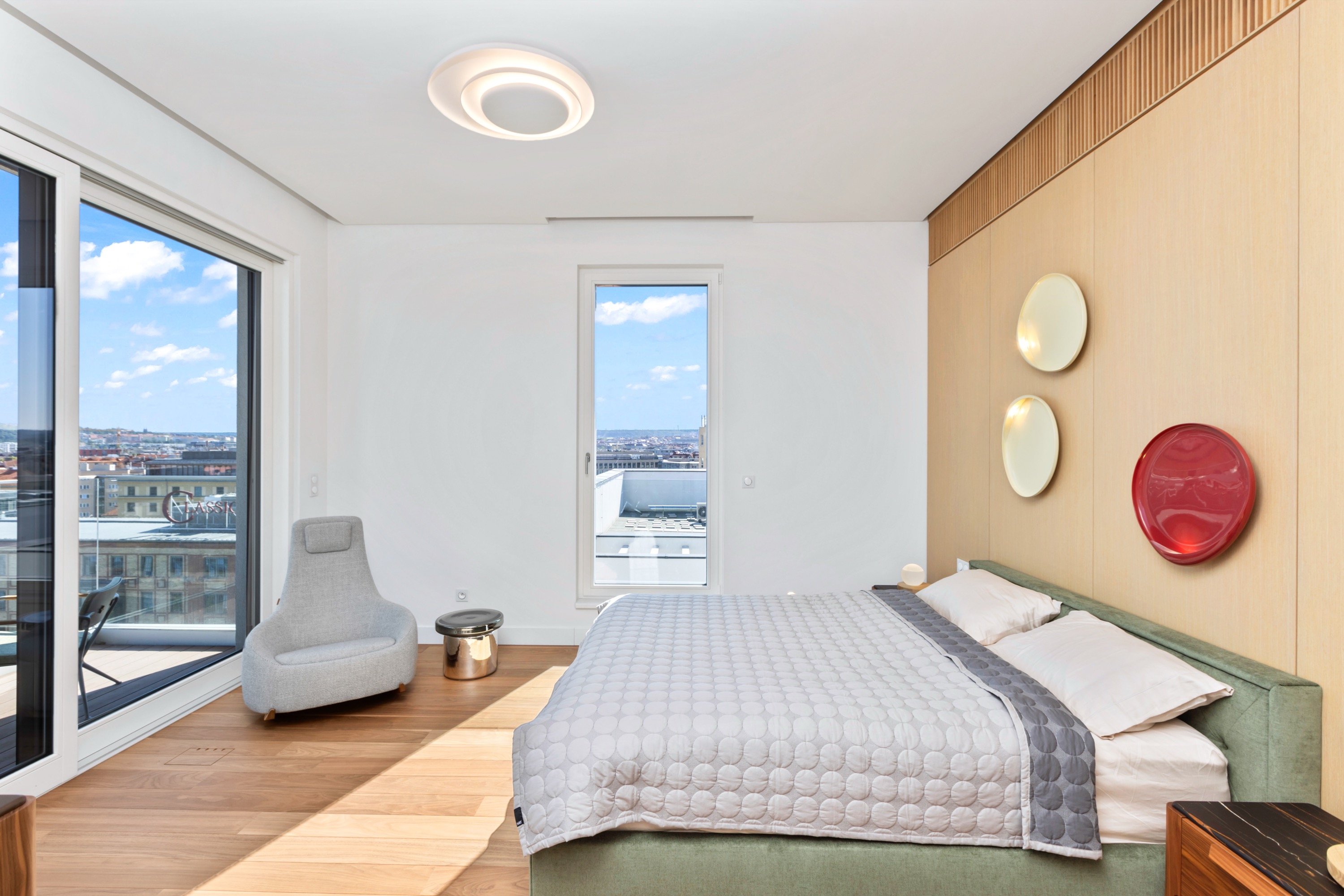 Každý detail je promyšlen pro maximální pohodlí – podlahové topení, klimatizace s individuálním nastavením v každé místnosti, elektrické žaluzie reagující na slunce, výtah s přímým vstupem do bytu a samozřejmě akustická izolace, díky které ruch města zůstává za okny.