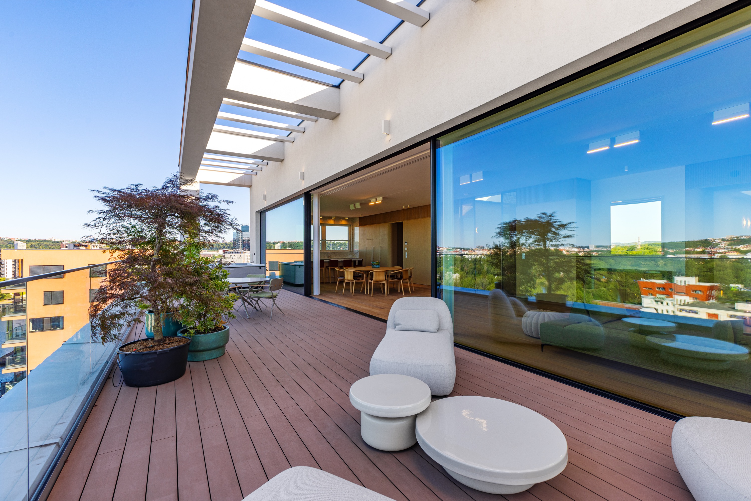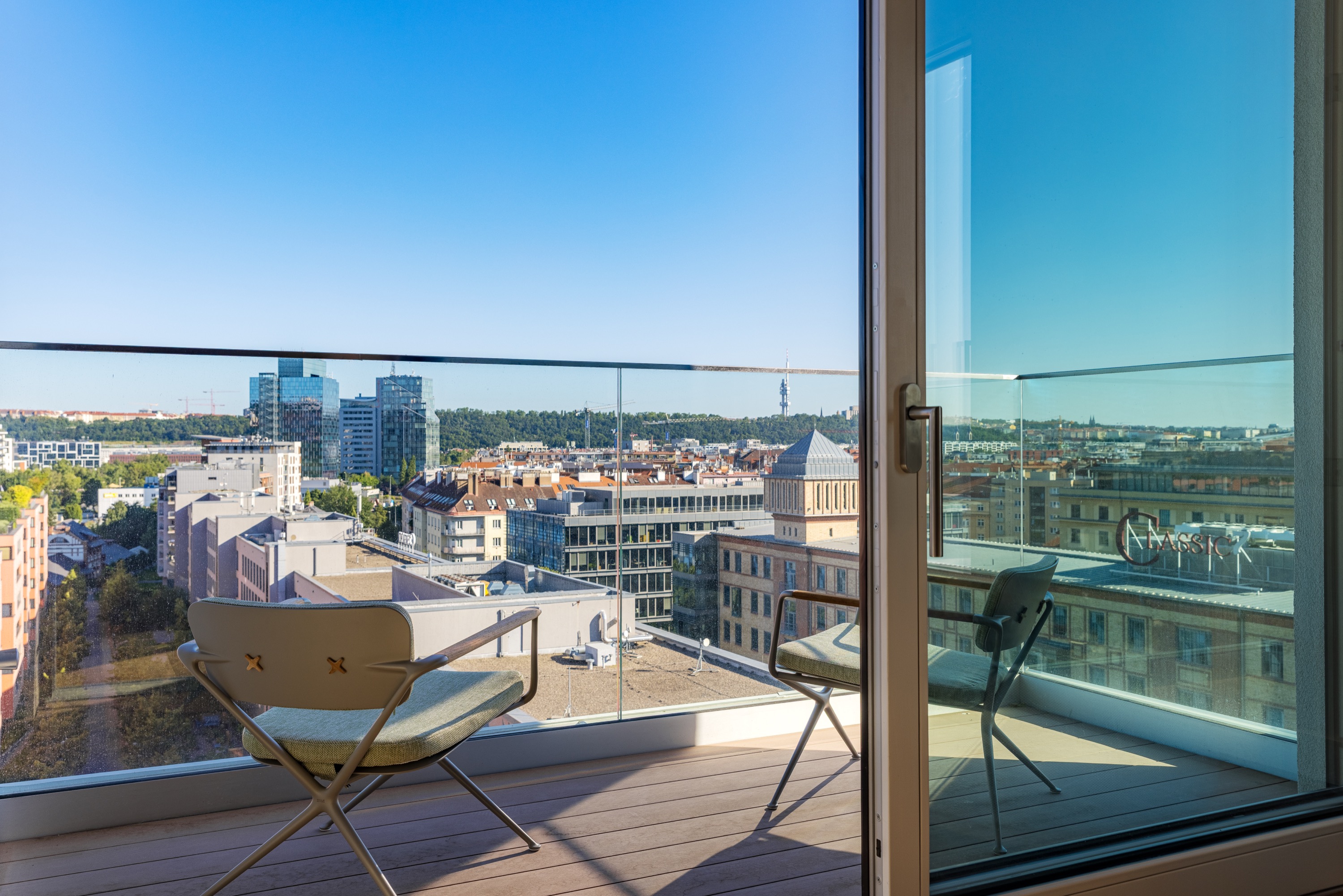Díky poloze v 10. nadzemním podlaží má penthouse bezkonkurenční 360° výhled, jehož středobodem je terasa o rozloze 74 m² orientovaná k Vltavě, kde nechybí ani luxusní vířivka. Dva menší balkóny (5 + 5 m²) doplňují pocit, že město je tu opravdu na dosah ruky – od zeleného svahu s Libeňským zámečkem až po dynamiku centra.