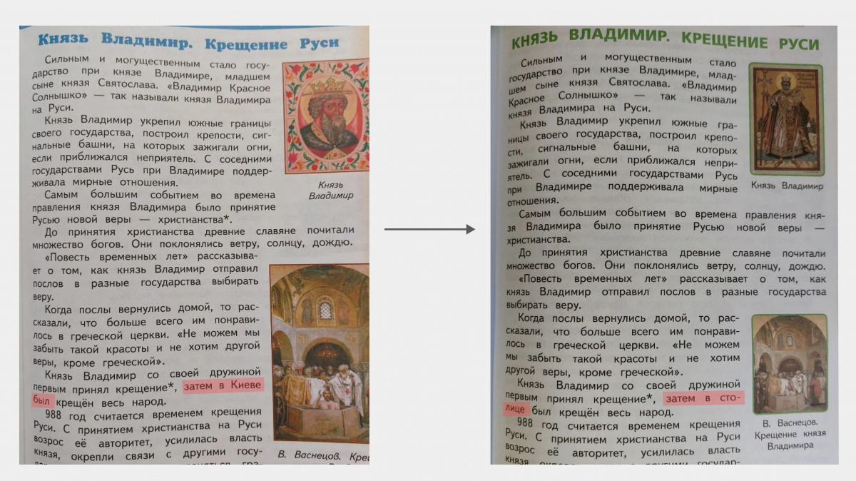 Ruský oficiální výklad války na Ukrajině už začaly odrážet i ruské učebnice. Takzvané speciální operaci se věnuje například nová učebnice dějepisu, podle níž se mají už od září začít učit žáci 11. třídy, upozornil ve středu web Nastojaščeje vremja spadající pod Rádio Svobodná Evropa. V dalších případech vznikají nová přepracovaná vydání. Například z učebnice vlastivědy pro 4. třídu zmizely z kapitoly věnující se období Kyjevské Rusi zmínky o Kyjevu, uvedl portál Mediazona. Přijetí křesťanství knížetem Vladimírem se podle této učebnice například neodehrálo v Kyjevě, ale „v hlavním městě“.