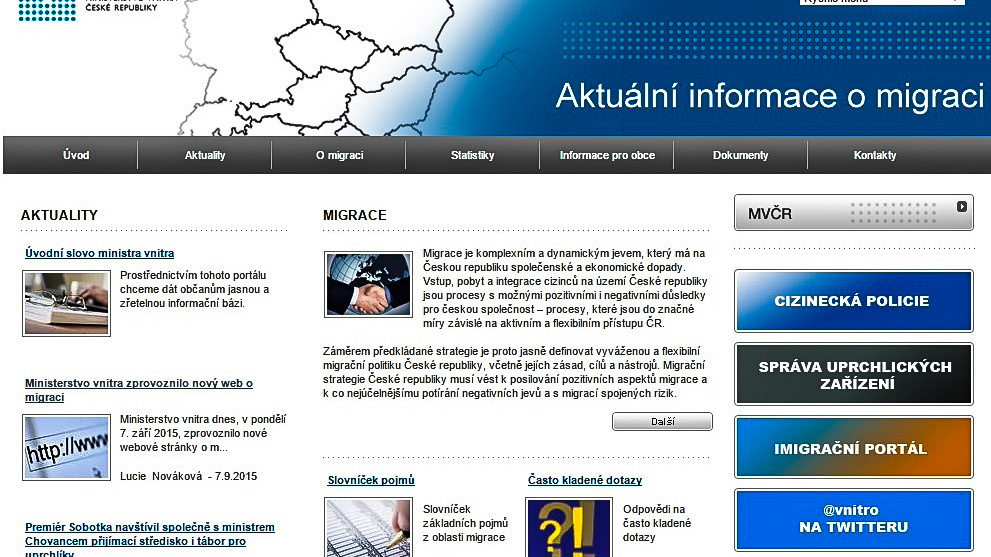 Ministerstvo vnitra spustilo kvůli uprchlické krizi nový web, na kterém chce občany informovat o aktuální migrační situaci. V úvodním textu vysvětluje, co je migrace. Na stránkách jsou také údaje k záchytným zařízením v Bělé pod Bezdězem, Zastávce u Brna a Vyšních Lhotách, kde se k pondělku nachází 1104 uprchlíků a zbývá tam 264 volných míst.