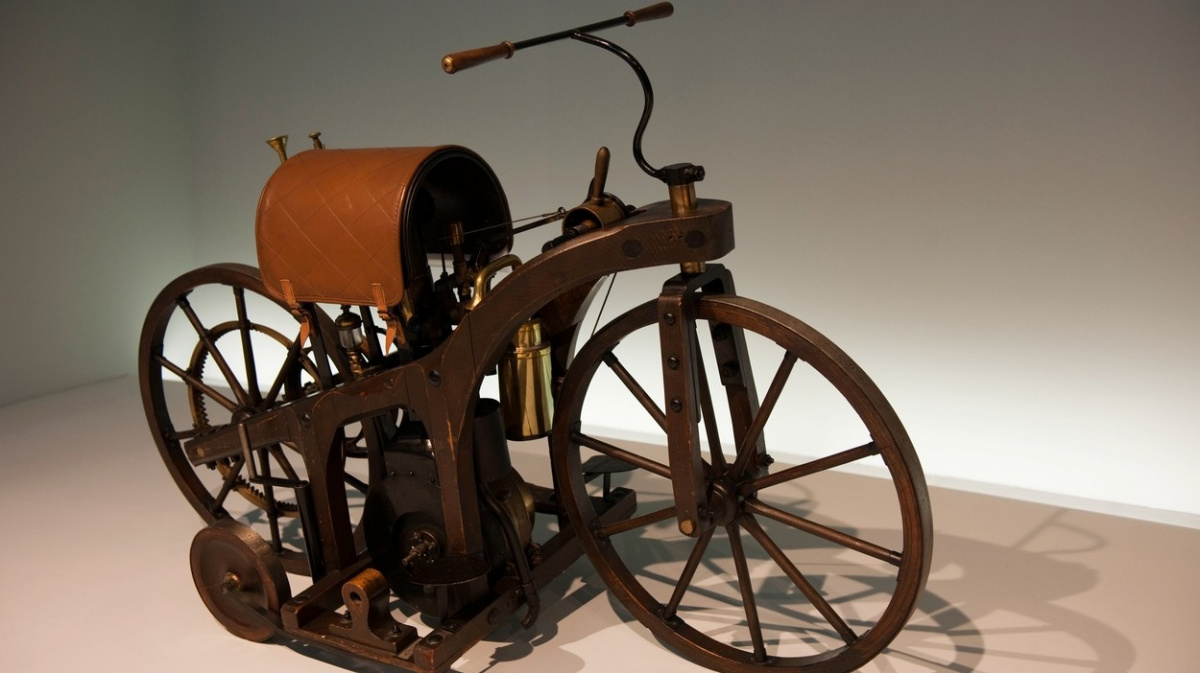 Dřevěný rám, motor o výkonu půl koně, kola pobitá železem a dvě přídavná postranní kolečka jako u bicyklů, na nichž se učí šlapat drobotina. Tak vypadal první motocykl s benzínovým motorem na světě. Vyvinuli jej Němci Gottlieb Daimler a Wilhelm Maybach a v srpnu 1885 si jej dali patentovat.